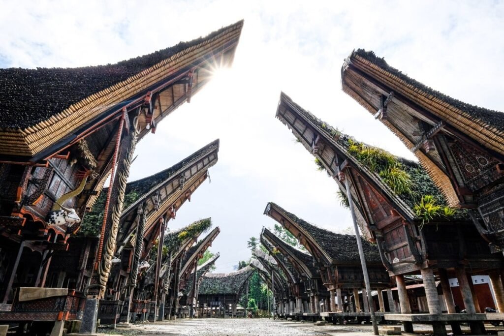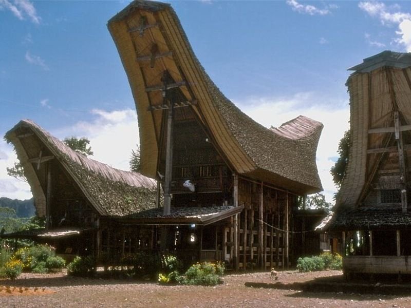Rumah adat Tongkonan memiliki bentuk atap melengkung seperti perahu dan dihiasi ukiran kayu berwarna merah, hitam, dan kuning. Bangunan ini tidak hanya menjadi tempat tinggal, tetapi juga pusat kehidupan sosial dan spiritual. Setiap ukiran memiliki makna filosofis tentang status sosial, hubungan keluarga, dan keyakinan leluhur.