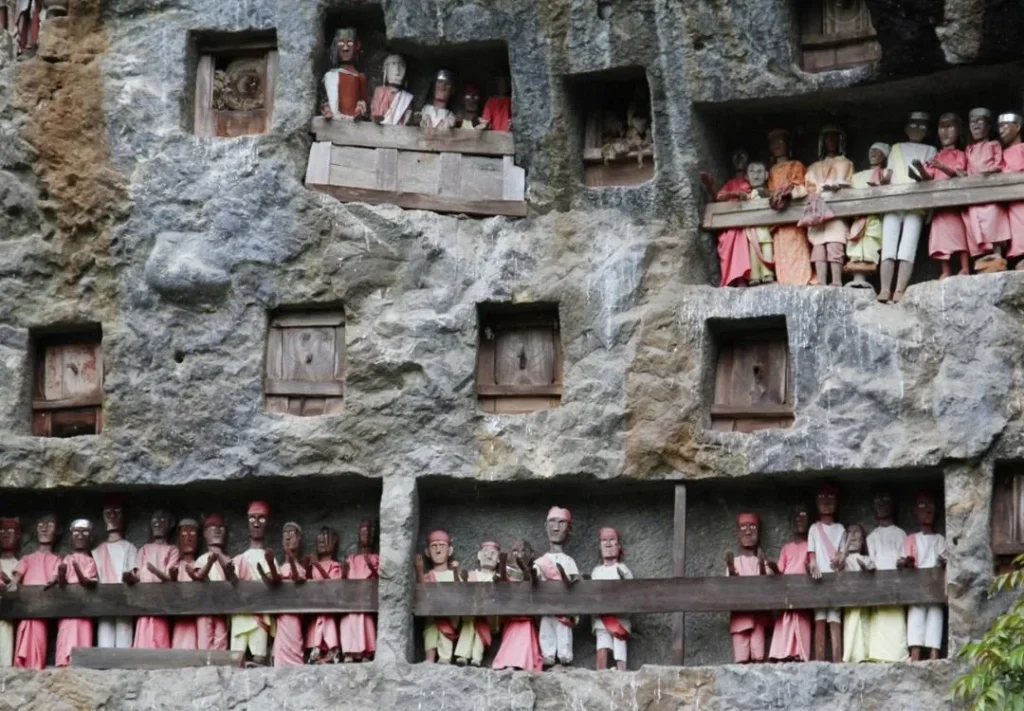 Tana Toraja juga terkenal dengan kuburan unik di tebing batu. Salah satu yang populer adalah Londa, gua batu kapur yang dijadikan tempat pemakaman. Di pintu gua, deretan patung kayu yang disebut tau-tau berdiri menghadap ke luar, melambangkan arwah keluarga yang telah meninggal. Ada pula Lemo, tebing besar dengan lubang-lubang pemakaman yang menjadi pemandangan ikonik.